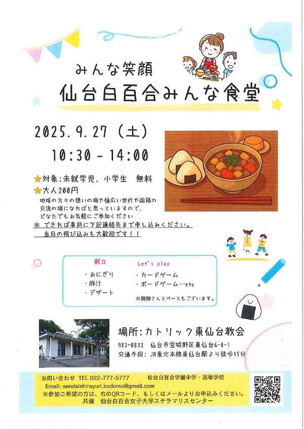 仙台白百合学園中学・高等学校と仙台白百合女子大学ステラマリスセンターが共催で「みんな笑顔 仙台白百合みんな食堂」を開催します。
