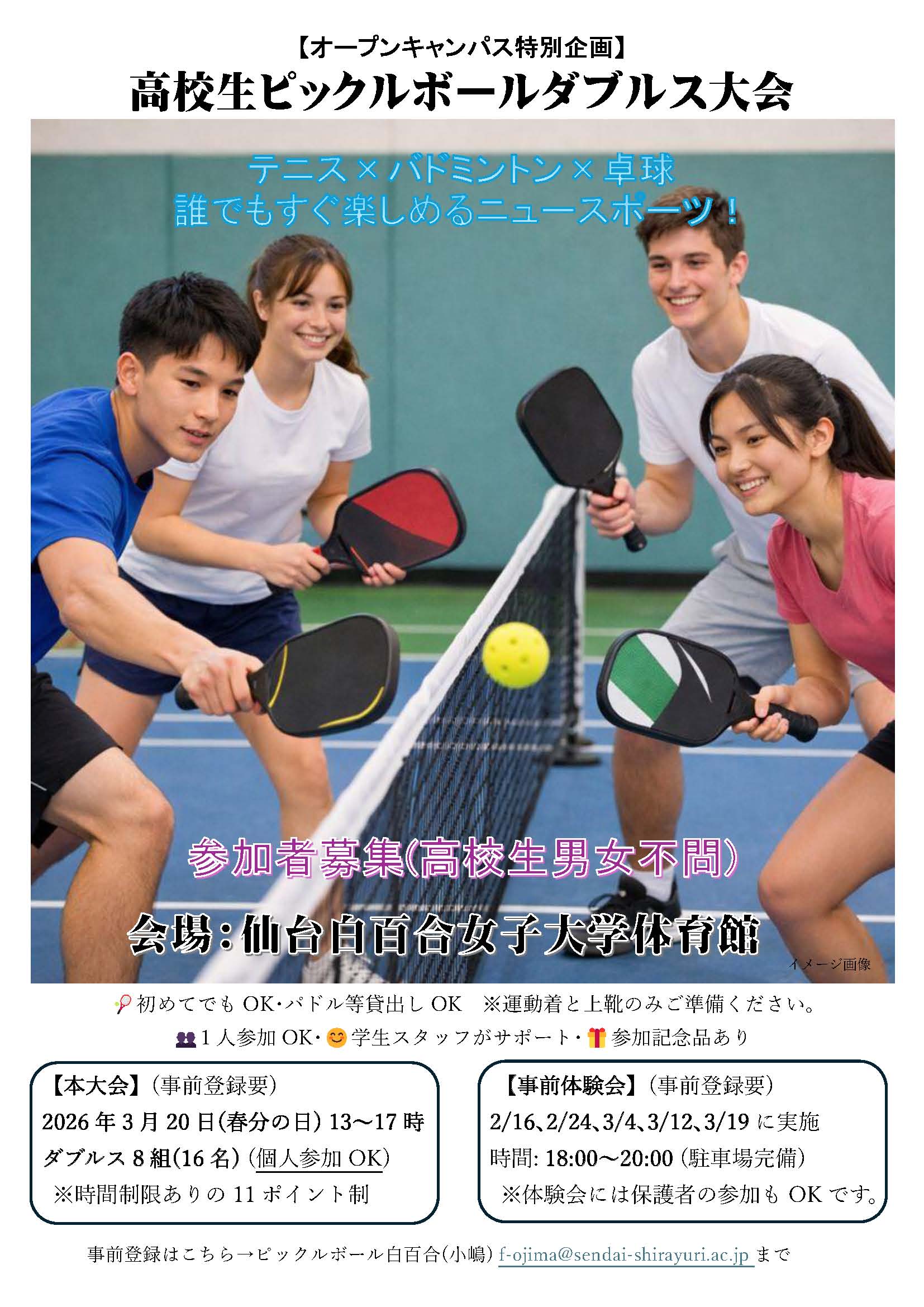 仙台白百合女子大学では、2026年3月20日(春分の日)のオープンキャンパスにて、今注目のニュースポーツ「ピックルボール」ダブルス大会を開催します!