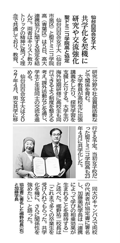 12月5日(金)本学と聖ドミニコ学院高等学校の高大連携協定が締結されました。この内容が、12月7日(日)河北新報に掲載されました。