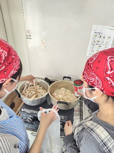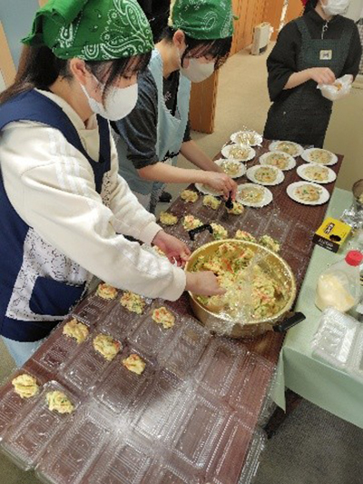 4月12日(土)10:30~14:00、カトリック東仙台教会を会場に、仙台白百合学園高校の高校生が企画したみんな食堂を開催しました。本学健康栄養学科、佐々木ゼミの学生は提供する食事の調理を担当しました。今回で4回目の開催となりましたが、近隣にお住いの親子連れや教会関係の皆さまなどに大勢ご来場いただきました。ご来場の皆さんと高校生が一緒に食事をしたり、テーブルゲームで遊んだりとアットホームな雰囲気で楽しんで頂きました。今後もみんな食堂の活動を継続していきたいと思います。