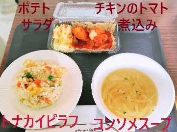 今回はクリスマスをテーマに、揚げたレンコンをトナカイの角に見立てた「トナカイピラフ」をはじめ、「チキンのトマト煮込み」「ポテトサラダ」「コンソメスープ」を提供しました。