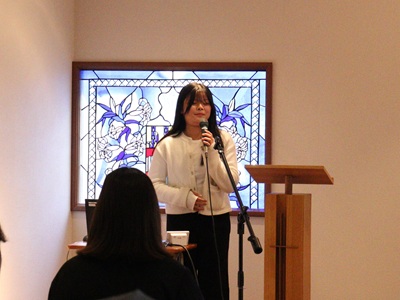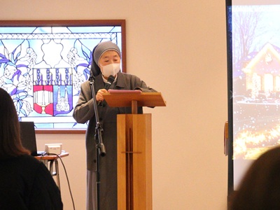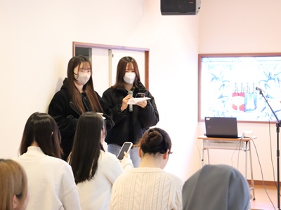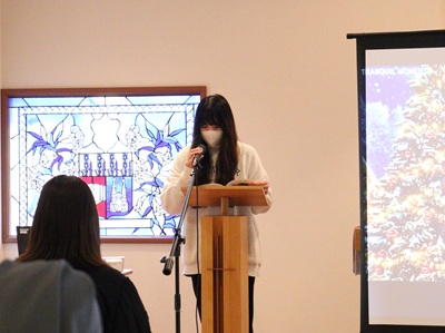 開会の言葉では、司会の松野莉子さんと太田理緒那さんより「アドベントとはラテン語で“到来”を意味する」と紹介があり、「救い主を待ち望む期間として心に光を灯しましょう」と呼びかけられました。続いて学生会長の門間結希さんからは「今年は“もらうクリスマス”だけでなく、“与えるクリスマス”にしてほしい」と挨拶があり、参加者に深いメッセージが届けられました。