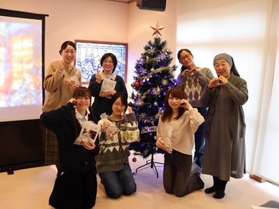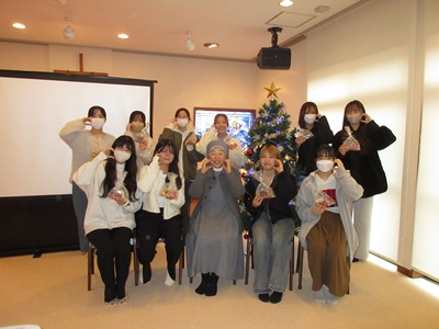 その後、加藤美紀学長先生から「サンタクロースの起源とその精神」についてのお話がありました。聖ニコラスの慈愛の行いが世界各地に伝わり、今日のサンタクロース像へとつながっていること、そしてクリスマスは“分かち合う愛”を祝う時であることが語られました。先生は「困難や悲しみを抱える人々に寄り添い、光を分かち合う心を大切にしてほしい」と呼びかけられました。