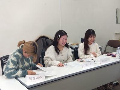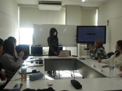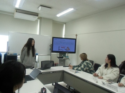 1月15日(木)、「プレゼンテーション演習Ⅱ」の授業でグローバル・スタディーズ学科の4年生3名が、「スチューデントアシスタント」として、研究発表会の補助業務(司会、座長、タイムキーパー)を行いました。後輩たちが緊張せずに発表できるよう、ソフトな語り口で司会をしたり、パソコンのトラブルによる急なスケジュール変更に対応したりするなど、4年生としての貫禄を見せてくれました。発表の最後には貴重なアドバイスや感想も述べてくれました。後輩たちも上級生と接する機会がもてて、大変勉強になったと話していました。