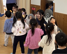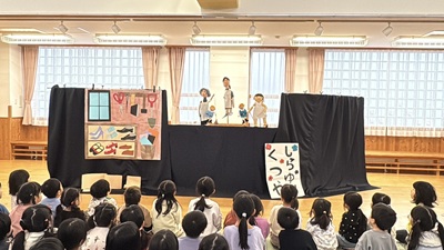 2026年1月19日、子ども教育学科4年千ゼミは、教育活動にご協力いただいている鼎会の認定こども園2園(桂こどもの城・明石南こどもの城)にて、今年度最後となる手作り人形劇の出前公演を実施しました。学生が舞台設営から上演、片付けまでを担当し、両園で公演を行いました。